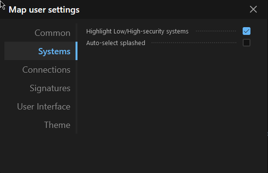 • In the Systems section, Enable Auto-Select splashed unless you want only a specific character to be followed on the map and optionally the Highlight Low/High-security systems